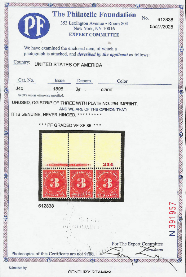 8339 nh J40 imagePostage Due, 1895, 3¢ deep claret, D.L. watermark (Scott J40), plate number single, o.g., never hinged, Very Fine to Extremely Fine, with photocopy of 2025 P.F. certificate graded VF-XF 85 for strip.