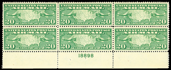 8322 nh/ogbl C9 imageAirmail, 1927, 20¢ Map & Planes (Scott C9), bottom margin plate block of 6 with plate number 18898, Bright, clear impression, o.g., lightly hinged (4 stamps never hinged); light gum bend on lower left stamp, Very Fine.