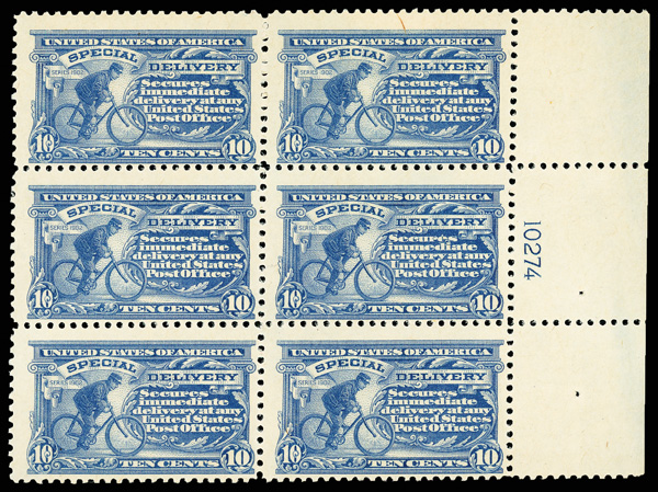 8333 nhbl E11 imageSpecial Delivery, 1917, 10¢ ultramarine (Scott E11), right margin plate block of 6 with plate number 10274, Clean and attractive stamps, o.g., never hinged; small inclusion on top right stamp, Fine.