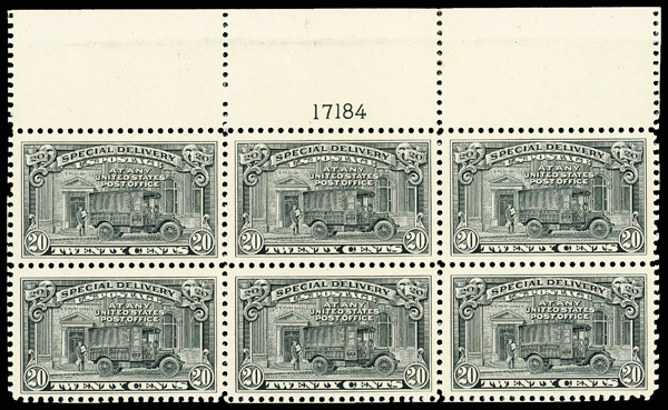 8337 nhbl E14 imageSpecial Delivery, 1925, 20¢ black (Scott E14), top margin plate block of 6 with plate number 17184, Exceptionally bright and clean, o.g., never hinged; reinforced perf separations at top, Very Fine.