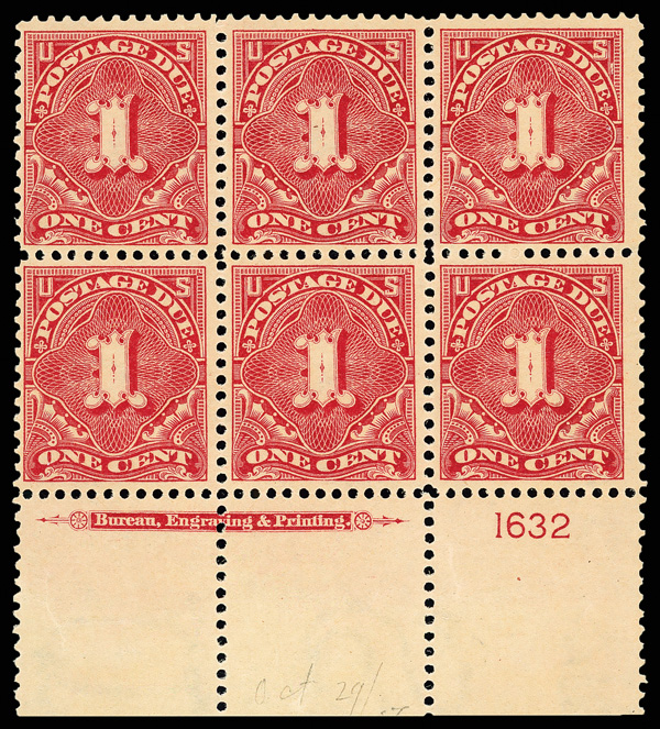 8338 nhbl J38 imagePostage Due, 1895, 1¢ deep claret, D.L. watermark (Scott J38), bottom margin plate block of 6 with plate number 1632, Crisp and clean example, o.g., never hinged, Fine to Very Fine.