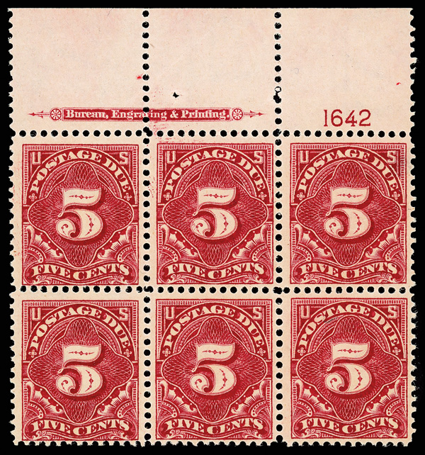 8340 nh/ogbl J41 imagePostage Due, 1895, 5¢ deep claret, D.L. watermark (Scott J41), top margin plate block of 6 with plate number 1642, Attractive with notable freshness, o.g., lightly hinged (3 stamps never hinged), Fine.