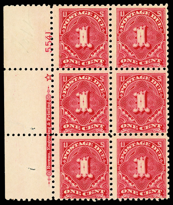 8341 nh/ogbl J52 imagePostage Due, 1914, 1¢ carmine lake, S.L. watermark, perf. 10 (Scott J52), left margin plate block of 6 with star and plate number 5541, Fresh with sharp detail, o.g., top stamps lightly hinged (4 stamps never hinged), Very Good to Fine.