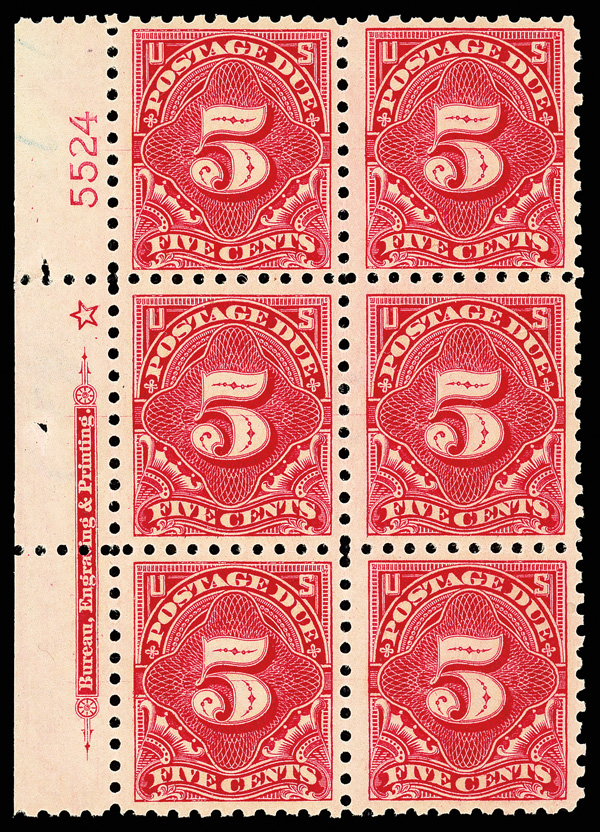 8342 nhbl J55 imagePostage Due, 1914, 5¢ carmine lake, S.L. watermark, perf. 10 (Scott J55), left margin plate block of 6 with star and plate number 5524, Fresh with strong visual appeal, o.g., never hinged, Fine to Very Fine.