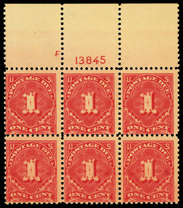 8343 ogbl J61 imagePostage Due, 1917, 1¢ carmine rose, unwatermarked, perf. 11 (Scott J61), top margin plate block of 6 with plate number F 13845, Clean and fresh surfaces, o.g., previously hinged, Fine.