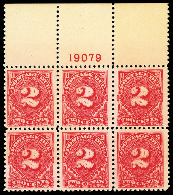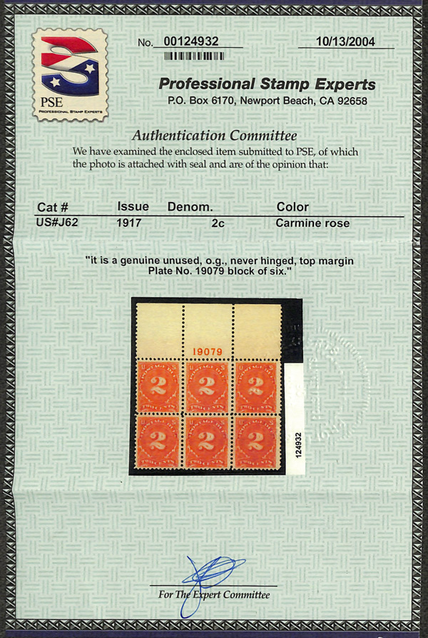 8344 nhbl J62 imagePostage Due, 1917, 2¢ carmine rose, unwatermarked, perf. 11 (Scott J62), top margin plate block of 6 with plate number 19079, Fresh and well centered, o.g., never hinged, Very Fine to Extremely Fine, with 2004 P.S.E. certificate.
