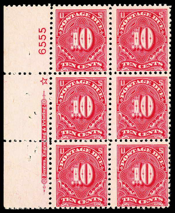 8346 nhbl J65 imagePostage Due, 1917, 10¢ carmine rose, unwatermarked, perf. 11 (Scott J65), left margin plate block of 6 with star and plate number 6555, Clean with fresh appearance, o.g., never hinged; perf disc indents on lower right stamp, several staple holes in selvage, Fine.