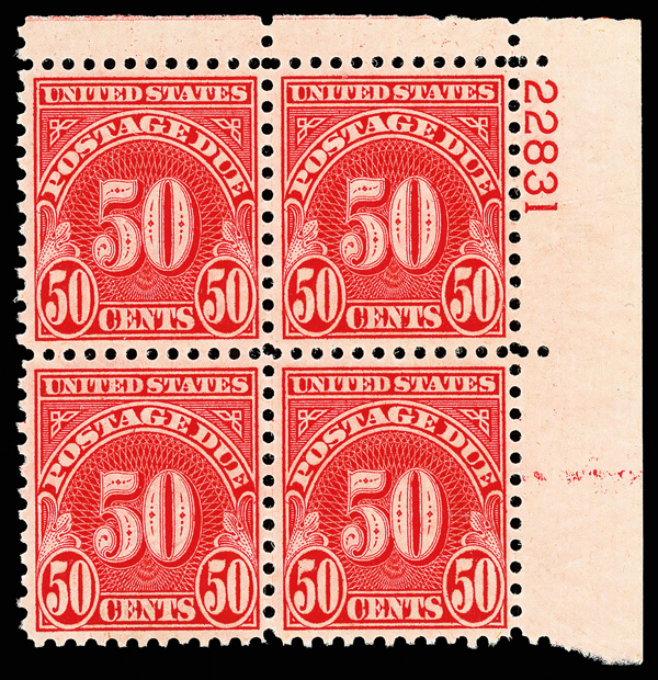 8348 nhbl J86a imagePostage Due, 1931, 50¢ scarlet (Scott J86a), top right plate block of 4 with plate number 22831, Fresh, bold presentation, o.g., never hinged, Very Fine.