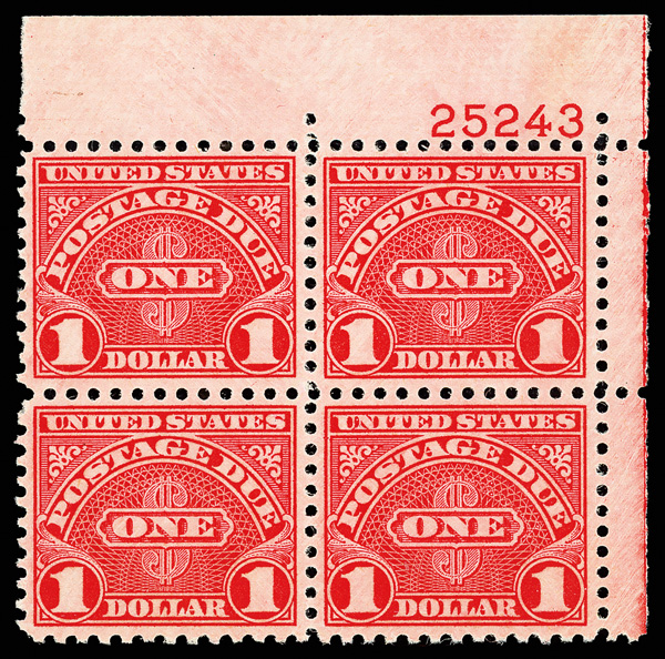 8349 nhbl J87 imagePostage Due, 1956, $1 scarlet (Scott J87), top right plate block of 4 with plate number 25243, Fresh in every respect, o.g., never hinged, Very Fine.