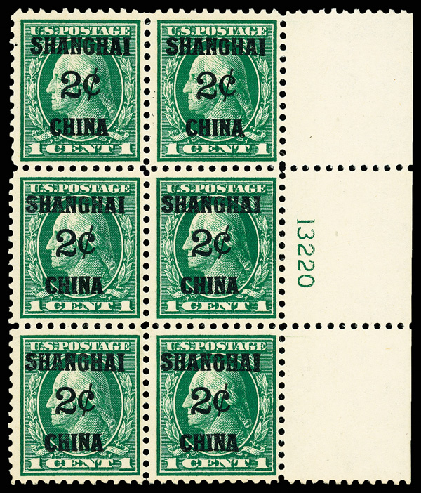 8351 ogbl K1 imageOffices in China, 1919, 2¢ on 1¢ green (Scott K1), right margin plate block of 6 with plate number 13220, Clean, sharp, and fresh, o.g., previously hinged, Fine to Very Fine.