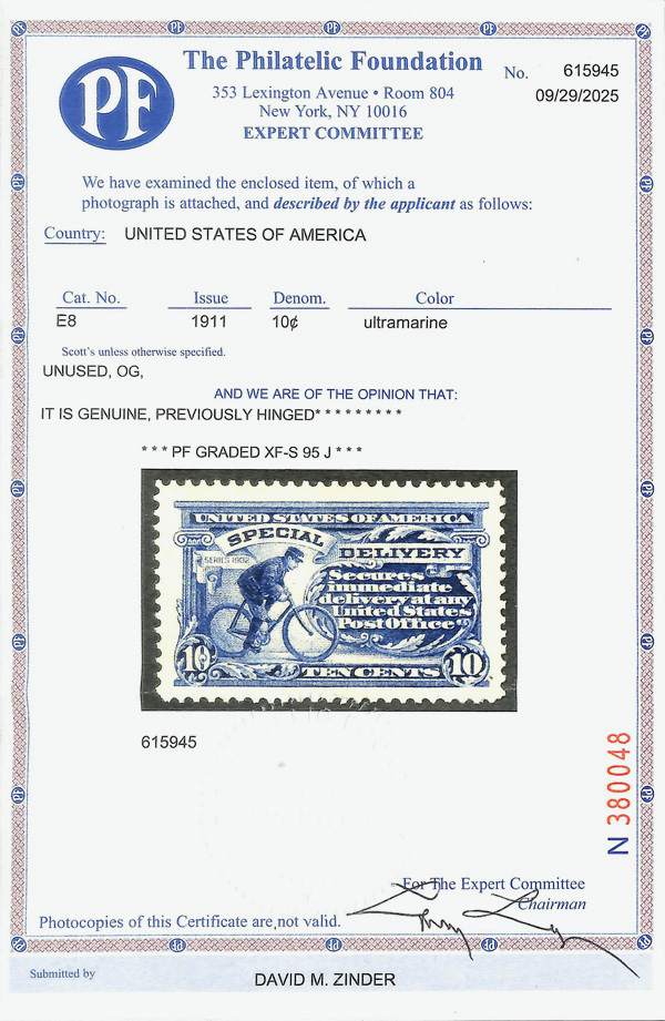 8331 og E8 imageSpecial Delivery, 1911, 10¢ ultramarine (Scott E8), o.g., hinge remnant, Extremely Fine to Superb, with 2025 P.F. certificate graded XF-SUP 95J.