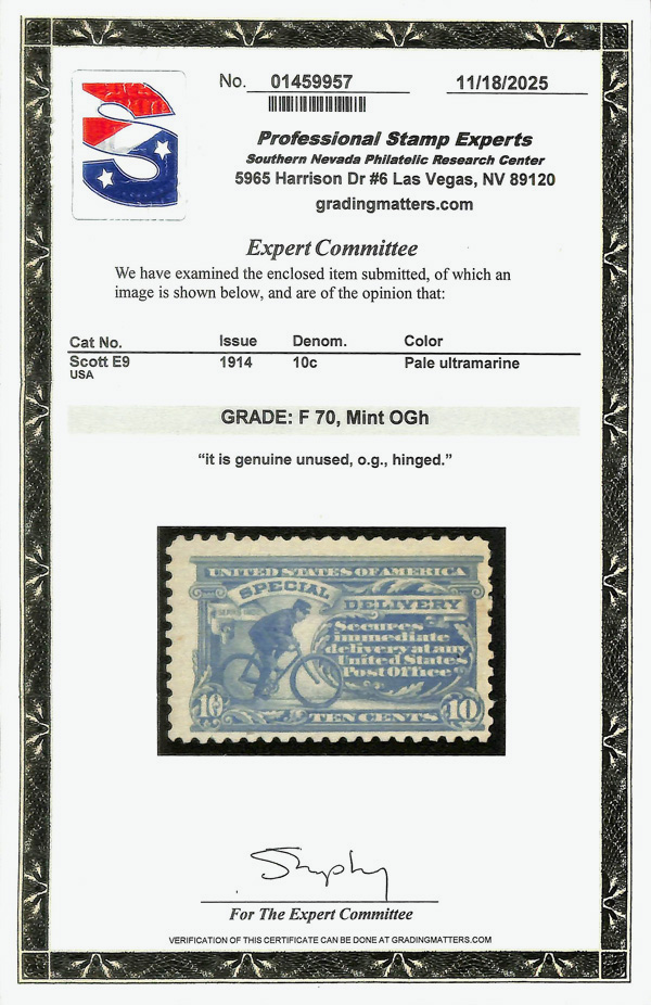 8332 og E9 imageSpecial Delivery, 1914, 10¢ ultramarine (Scott E9), o.g., hinge remnant, Fine, with 2025 P.S.E. certificate graded F 70.