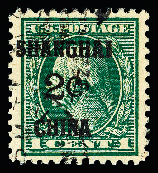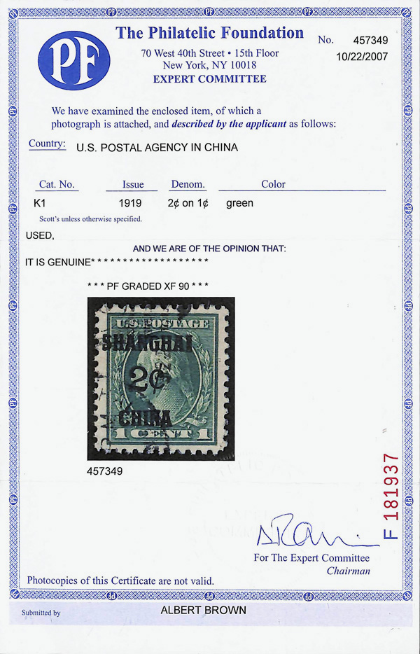 8352 O K1 imageOffices in China, 1919, 2¢ on 1¢ green (Scott K1), Evenly spaced margins, Extremely Fine, with 2007 P.S.E. certificate graded XF 90.