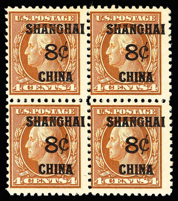 8356 nhbl K4 imageOffices in China, 1919, 8¢ on 4¢ brown (Scott K4), block of 4, Bright and bold, o.g., never hinged; a couple light gum bends, Fine.