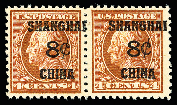 8355 nh K4 imageOffices in China, 1919, 8¢ on 4¢ brown (Scott K4), pair, Vividly bright hue, o.g., never hinged, Fine to Very Fine.