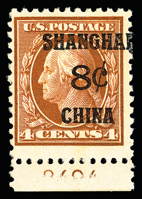 8354 nh K4 imageOffices in China, 1919, 8¢ on 4¢ brown (Scott K4), single with plate number, Deep original color, o.g., never hinged, Very Fine.