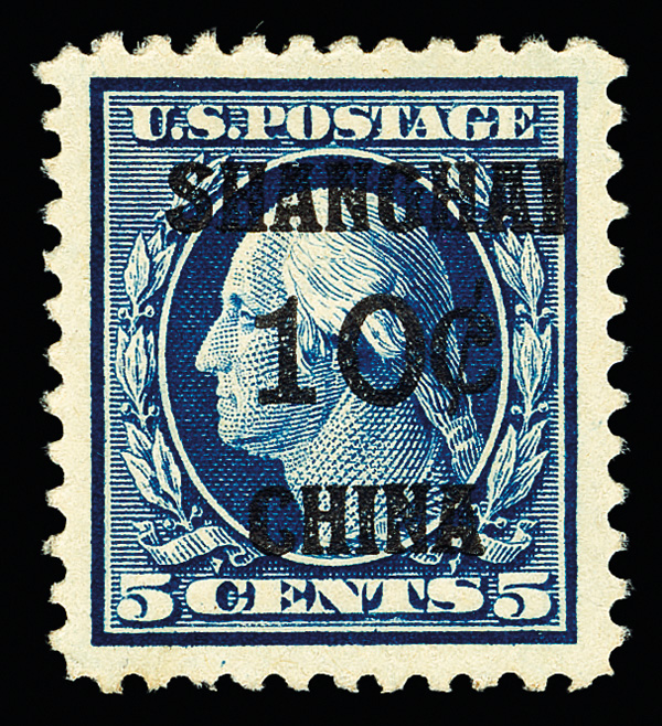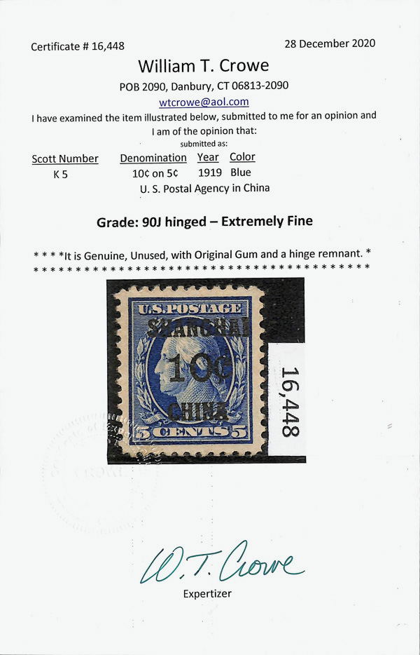 8357 og K5 imageOffices in China, 1919, 10¢ on 5¢ blue (Scott K5), Sparkling original hue, o.g., hinge remnant, Extremely Fine, with 2020 Crowe certificate graded XF 90J.