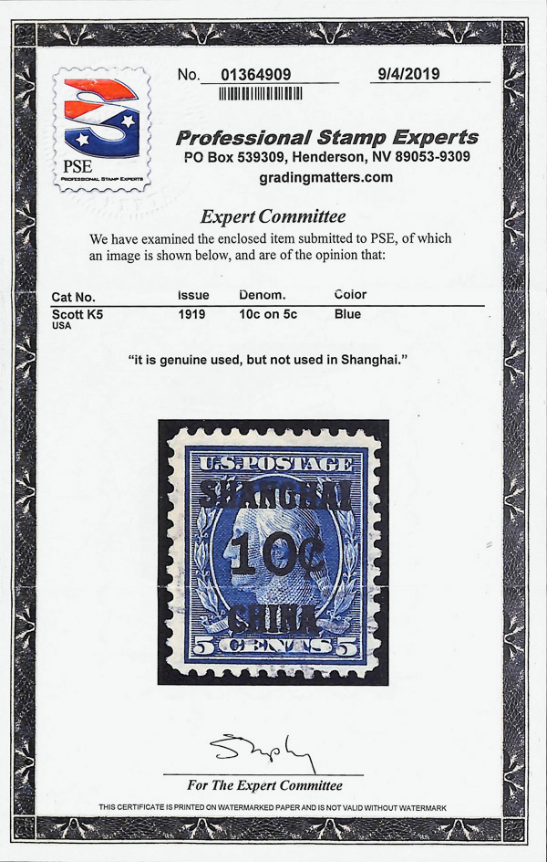8358 O K5 imageOffices in China, 1919, 10¢ on 5¢ blue (Scott K5), Deep ink intensity, used, but not used in Shanghai, Very Fine, with 2019 P.S.E. certificate.