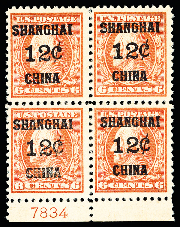 8360 nhbl K6 imageOffices in China, 1919, 12¢ on 6¢ red orange (Scott K6), block of 4 with plate number, Strikingly rich hue, o.g., never hinged, Fine to Very Fine.