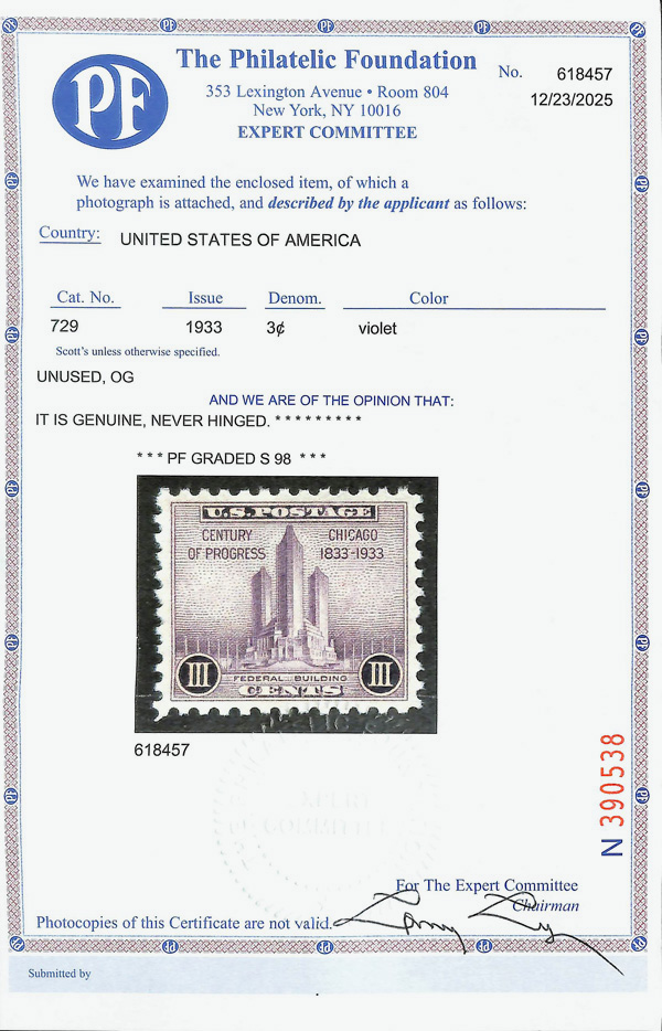 5416 nh 729 image1933, 3¢ Century of Progress (Scott 729), o.g., never hinged, Superb, with 2025 P.F. certificate graded SUP 98.