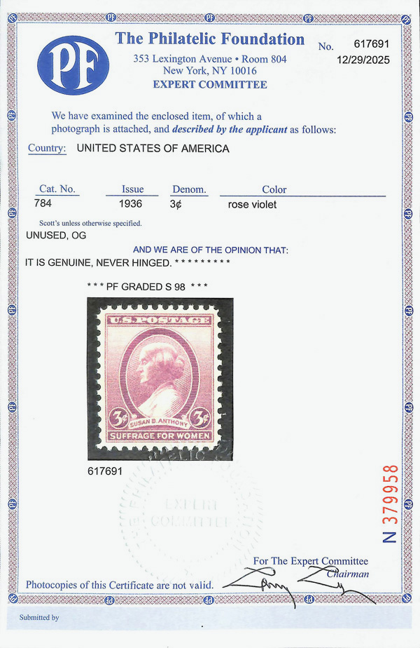5432 nh 784 image1936, 3¢ Susan B. Anthony (Scott 784), o.g., never hinged, Superb, with 2025 P.F. certificate graded SUP 98.