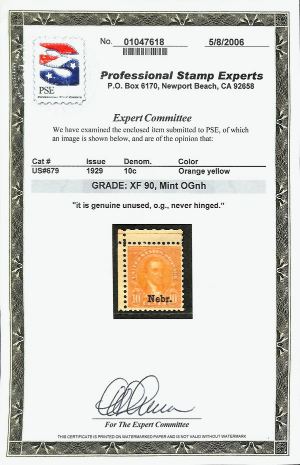 5405 nh 679 image1929, 10¢ Nebr. (Scott 679), o.g., never hinged, Extremely Fine, with 2006 P.S.E. certificate graded XF 90.