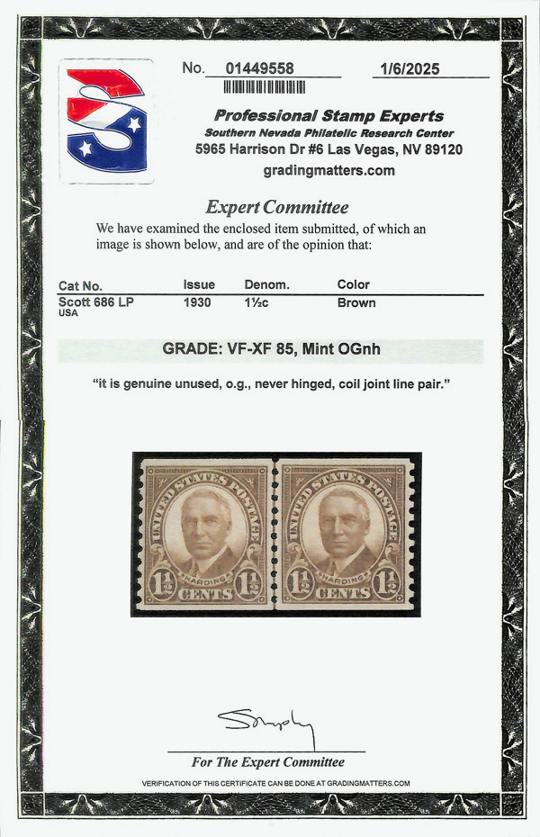 5407 nh 686 image1930, 1½¢ Harding, rotary press coil (Scott 686), joint line pair, o.g., never hinged, Very Fine to Extremely Fine, with 2025 P.S.E. certificate graded VF-XF 85.