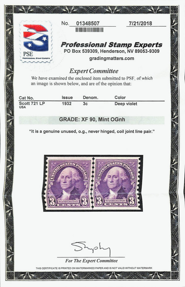 5413 nh 721 image1932, 3¢ Washington, rotary press printing, horizontal coil (Scott 721), joint line pair, o.g., never hinged, Extremely Fine, with 2018 P.S.E. certificate graded XF 90.