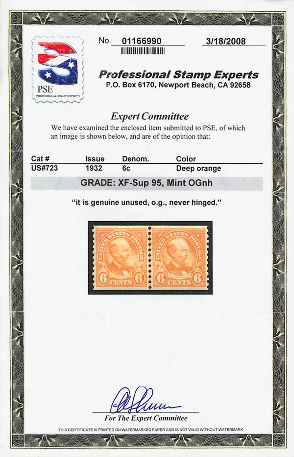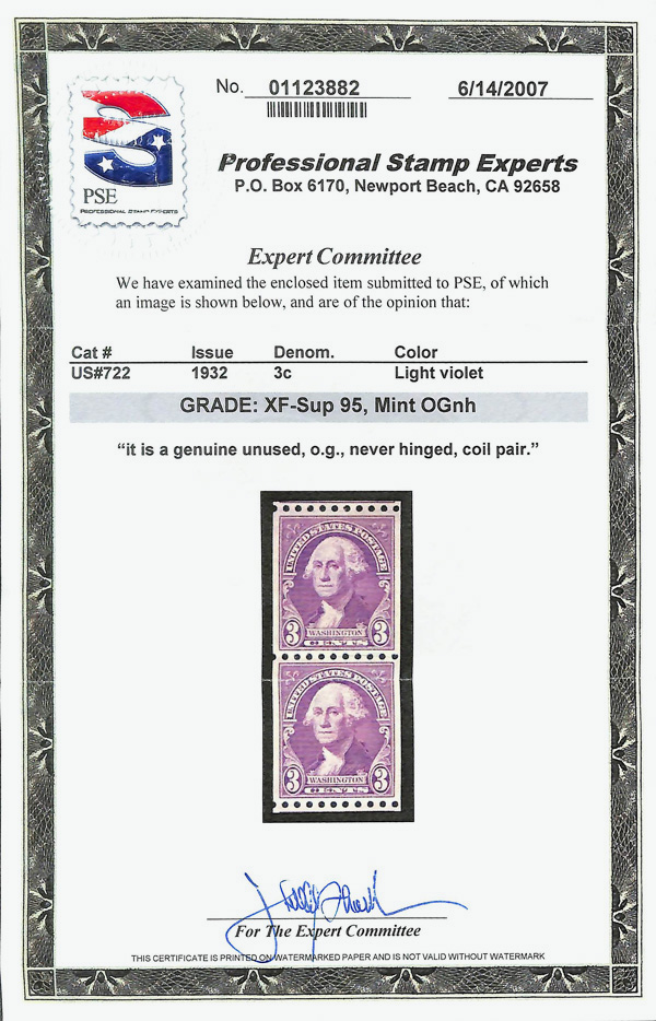 5414 nh 722 image1932, 3¢ Washington, rotary press printing, vertical coil (Scott 722), pair, o.g., never hinged, Extremely Fine to Superb, with 2007 P.S.E. certificate graded XF-SUP 95.