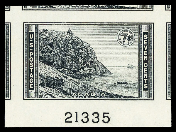 5426 ng 762 image1935, 7¢ Acadia National Park, imperf. (Scott 762), without gum as issued, jumbo margins, Superb, with 2024 P.S.E. certificate graded GEM 100J.