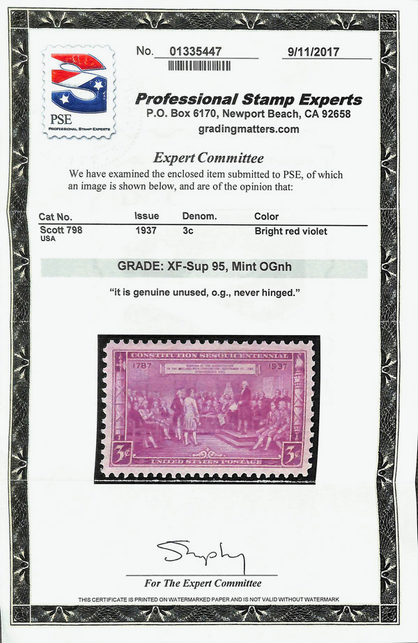 5437 nh 798 image1937, 3¢ Constitution (Scott 798), o.g., never hinged, Extremely Fine to Superb, with 2017 P.S.E. certificate graded XF-SUP 95.