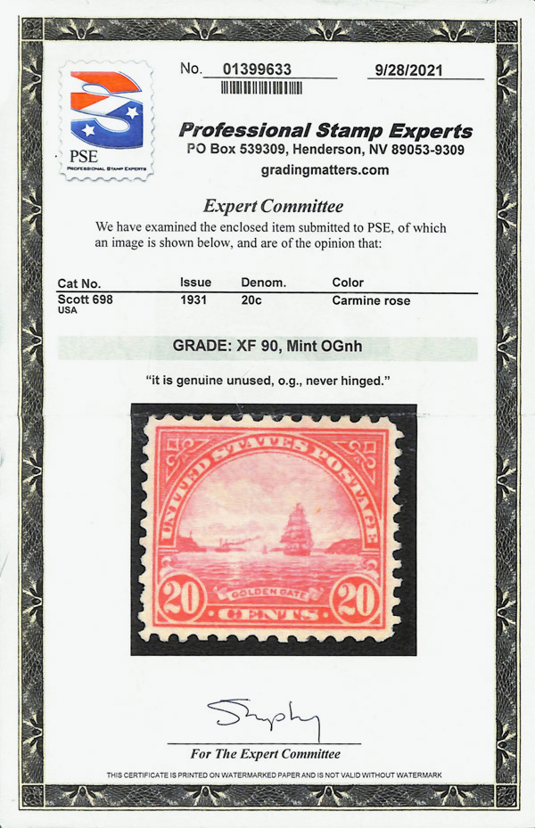 5409 nh 698 image1931, 20¢ Golden Gate, rotary press printing (Scott 698), o.g., never hinged, Extremely Fine, with 2021 P.S.E. certificate graded XF 90.