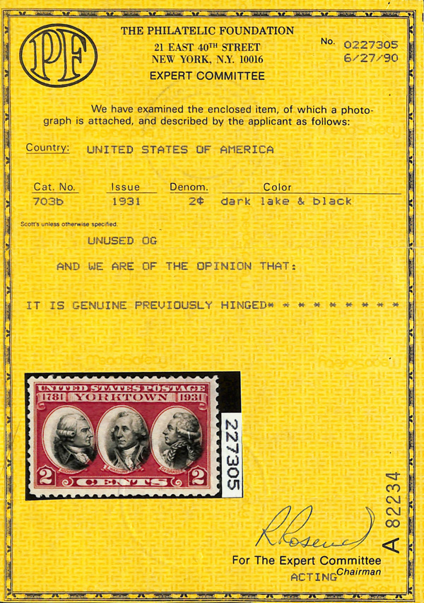 5411 og 703b image1931, 2¢ Yorktown, dark lake & black color (Scott 703b), o.g., very lightly hinged, Fine to Very Fine, with 1990 P.F. certificate.