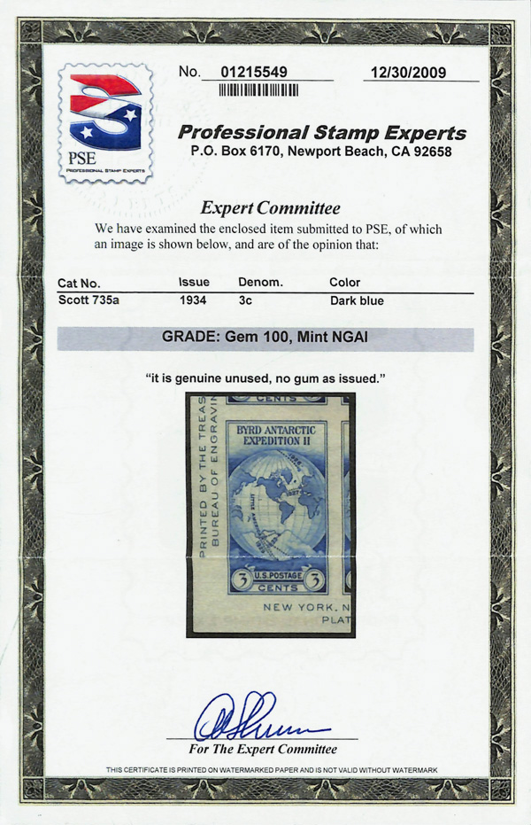 5418 ng 735a image1934, 3¢ National Stamp Exhibition, single from souvenir sheet (Scott 735a), without gum as issued, Superb, with 2009 P.S.E. certificate graded GEM 100.