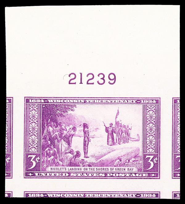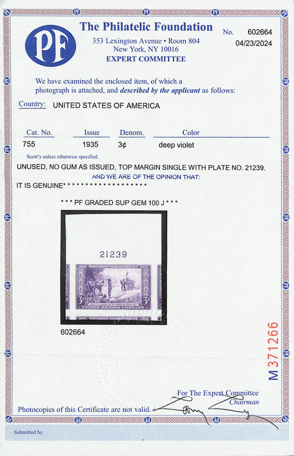 5425 ng 755 image1935, 3¢ Wisconsin, imperf. (Scott 755), without gum as issued, jumbo margins, Superb, with 2024 P.F. certificate graded GEM 100J.