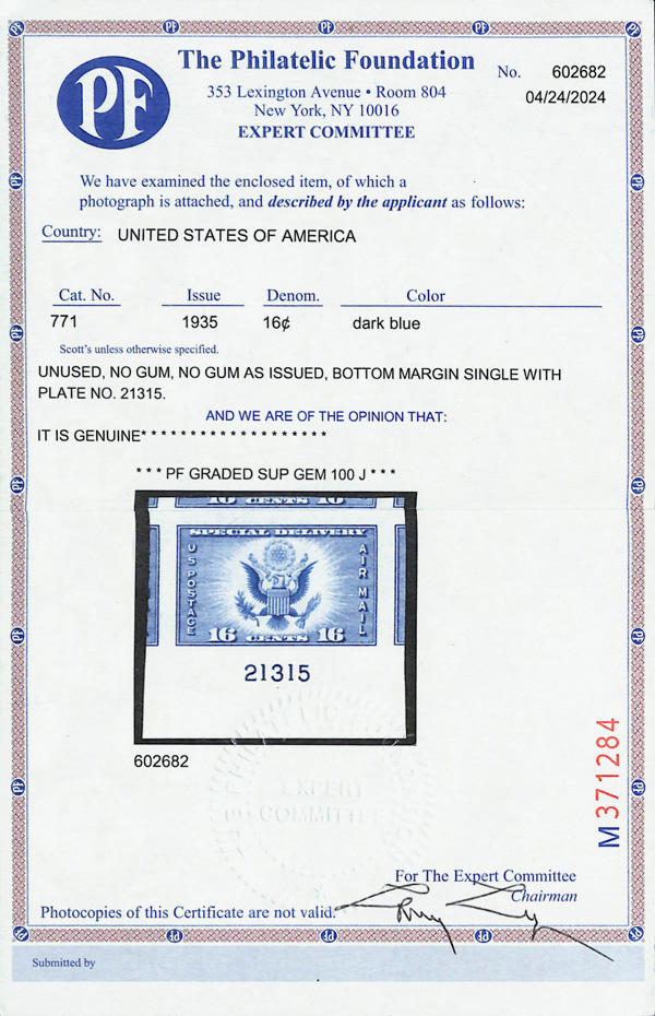 5427 ng 771 image1935, 16¢ Airmail Special Delivery, imperf. (Scott 771), without gum as issued, Superb, with 2024 P.F. certificate graded GEM 100J.