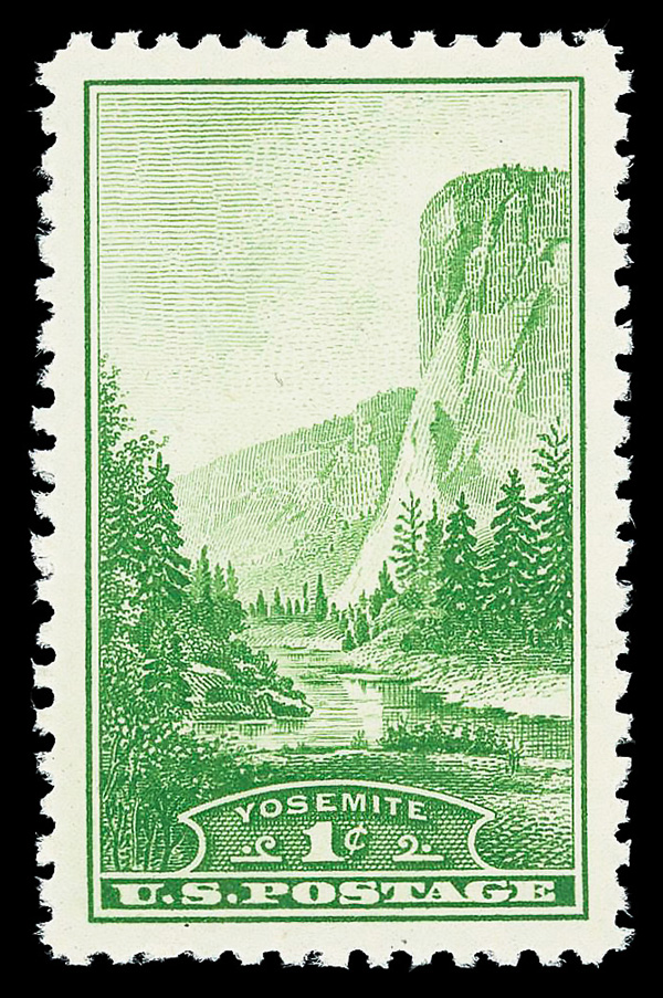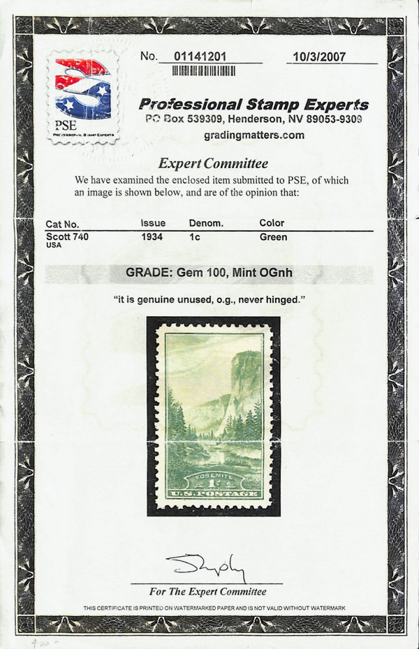 5419 nh 740 image1934, 1¢ Yosemite National Park, perforated (Scott 740), o.g., never hinged, Superb, with 2007 P.S.E. certificate graded GEM 100.