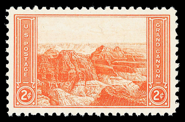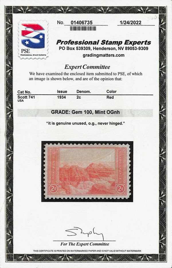 5420 nh 741 image1934, 2¢ Grand Canyon National Park, perforated (Scott 741), o.g., never hinged, Superb, with 2022 P.S.E. certificate graded GEM 100.