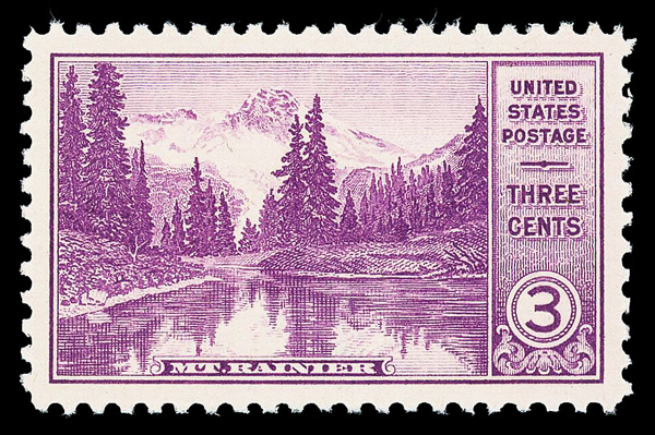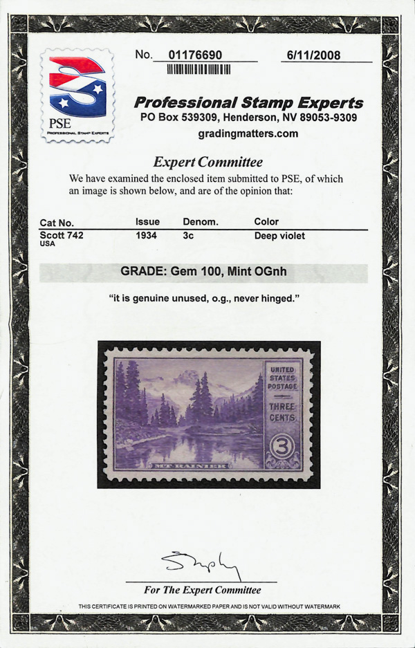 5421 nh 742 image1934, 3¢ Mt. Rainier National Park, perforated (Scott 742), o.g., never hinged, Superb, with 2008 P.S.E. certificate graded GEM 100.