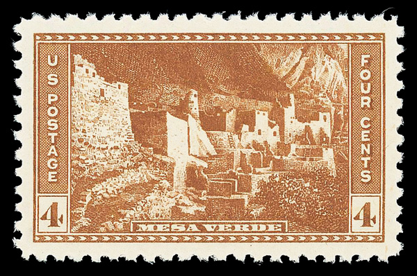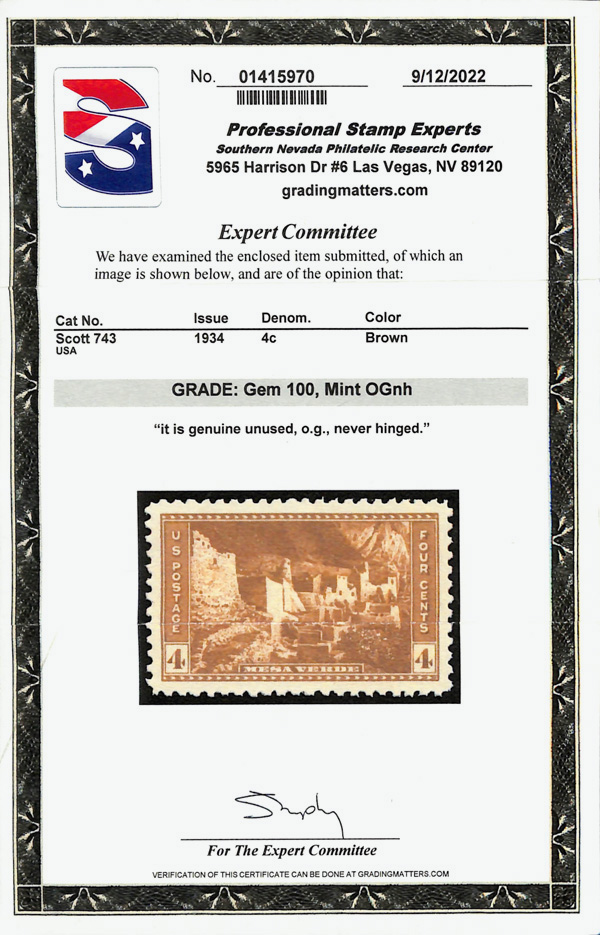 5422 nh 743 image1934, 4¢ Mesa Verde National Park, perforated (Scott 743), o.g., never hinged, Superb, with 2022 P.S.E. certificate graded GEM 100.