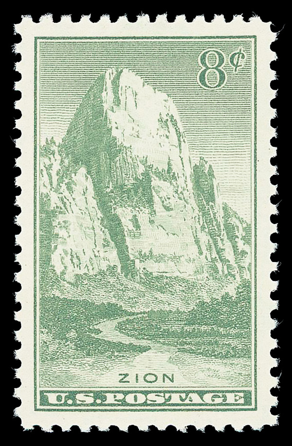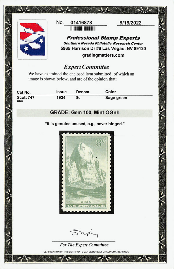 5423 nh 747 image1934, 8¢ Zion National Park, perforated (Scott 747), o.g., never hinged, Superb, with 2022 P.S.E. certificate graded GEM 100.