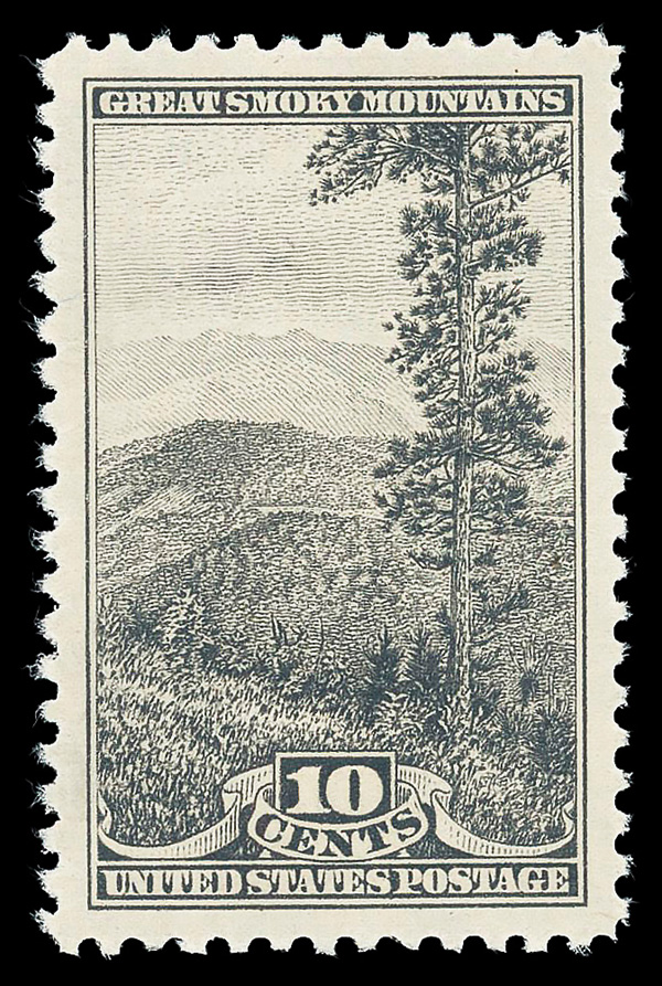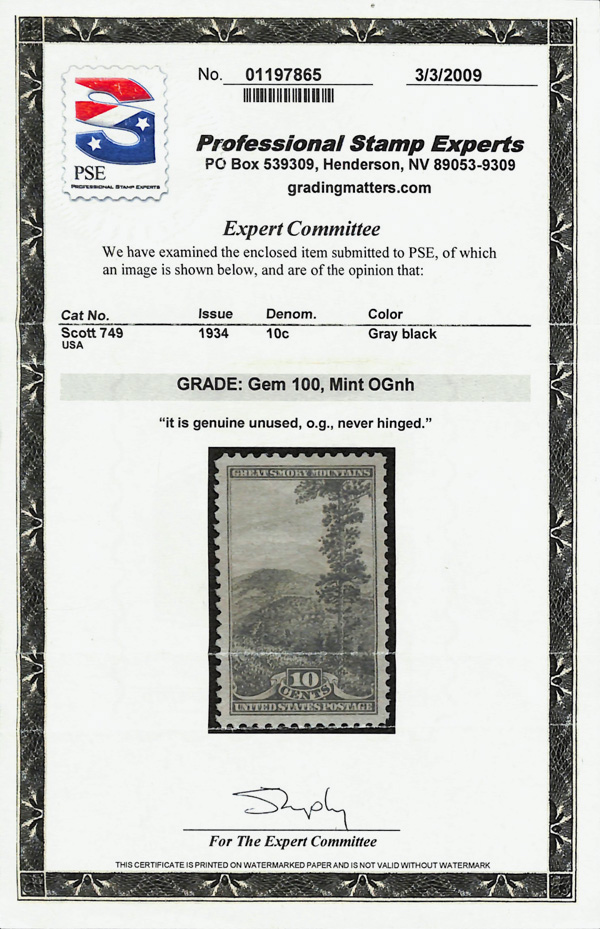 5424 nh 749 image1934, 10¢ Great Smoky Mountains, perforated (Scott 749), o.g., never hinged, Superb, with 2009 P.S.E. certificate graded GEM 100.