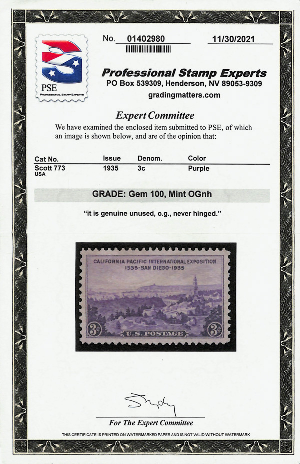 5428 nh 773 image1935, 3¢ California Pacific Exposition (Scott 773), o.g., never hinged, Superb, with 2021 P.S.E. certificate graded GEM 100.