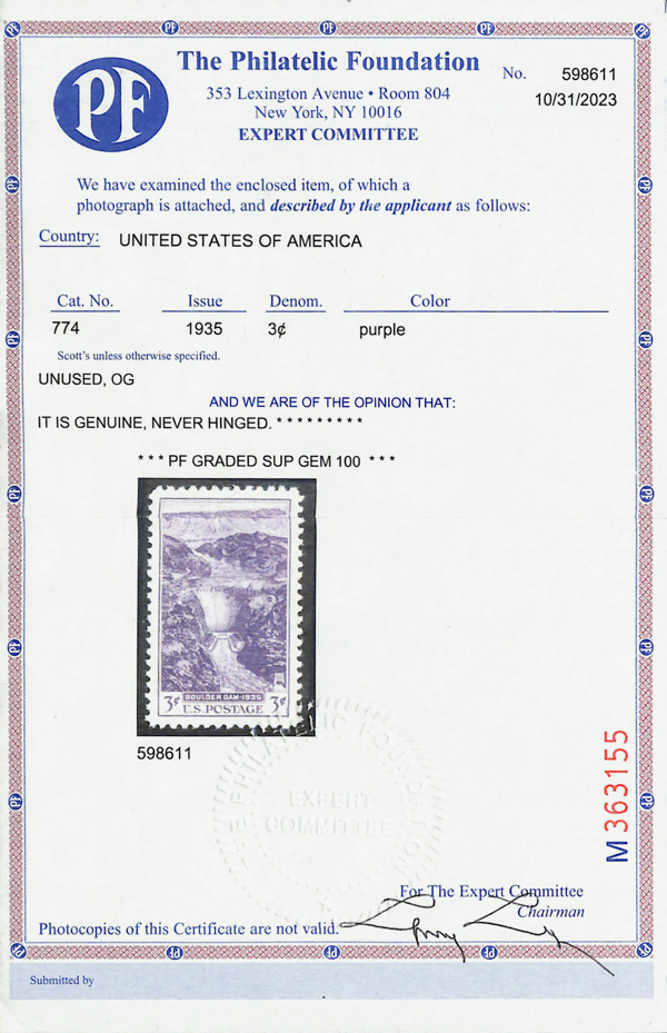 5429 nh 774 image1935, 3¢ Boulder Dam (Scott 774), o.g., never hinged, Superb, with 2023 P.F. certificate graded GEM 100.