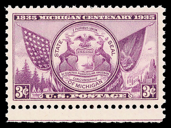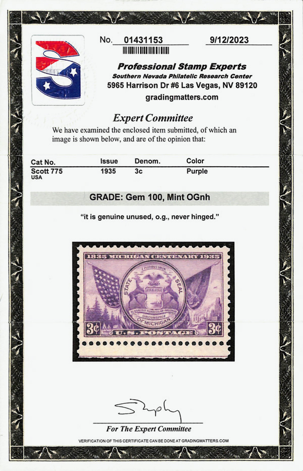 5430 nh 775 image1935, 3¢ Michigan Centenary (Scott 775), o.g., never hinged, Superb, with 2023 P.S.E. certificate graded GEM 100.