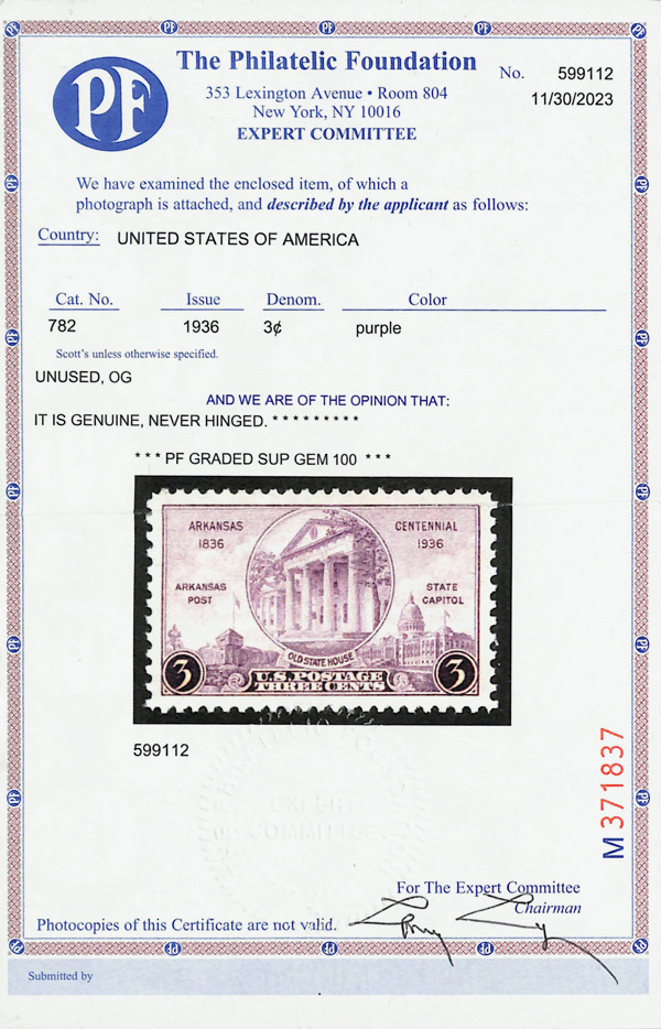 5431 nh 782 image1936, 3¢ Arkansas Centennial (Scott 782), o.g., never hinged, Superb, with 2023 P.F. certificate graded GEM 100.