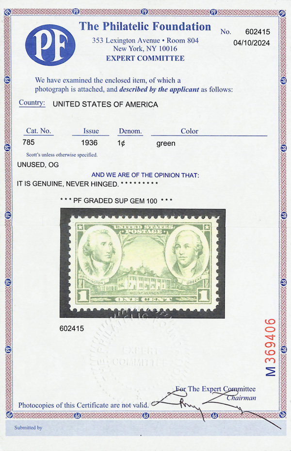 5433 nh 785 image1936, 1¢ Army (Scott 785), o.g., never hinged, Superb, with 2024 P.F. certificate graded GEM 100.