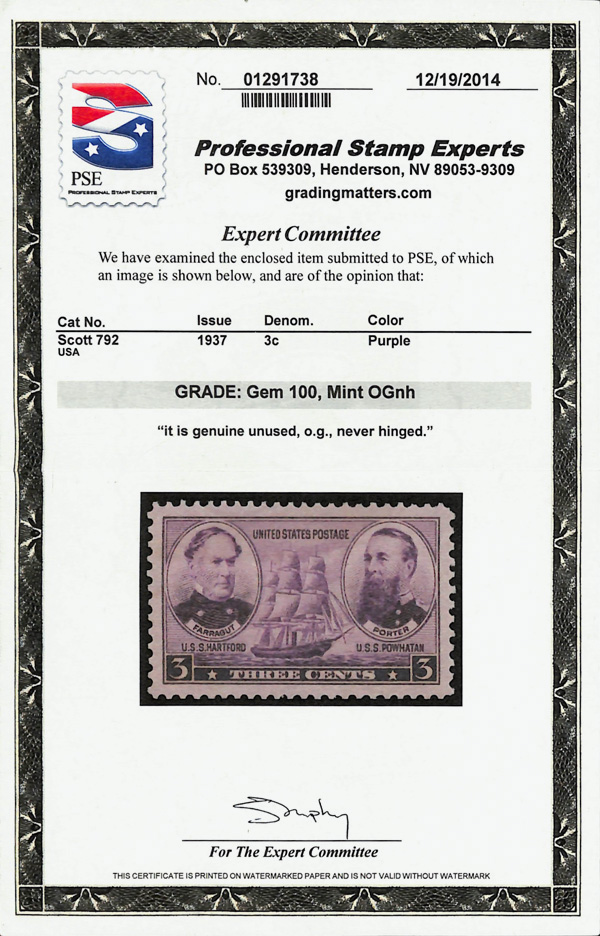 5434 nh 792 image1937, 3¢ Navy (Scott 792), o.g., never hinged, Superb, with 2014 P.S.E. certificate graded GEM 100.