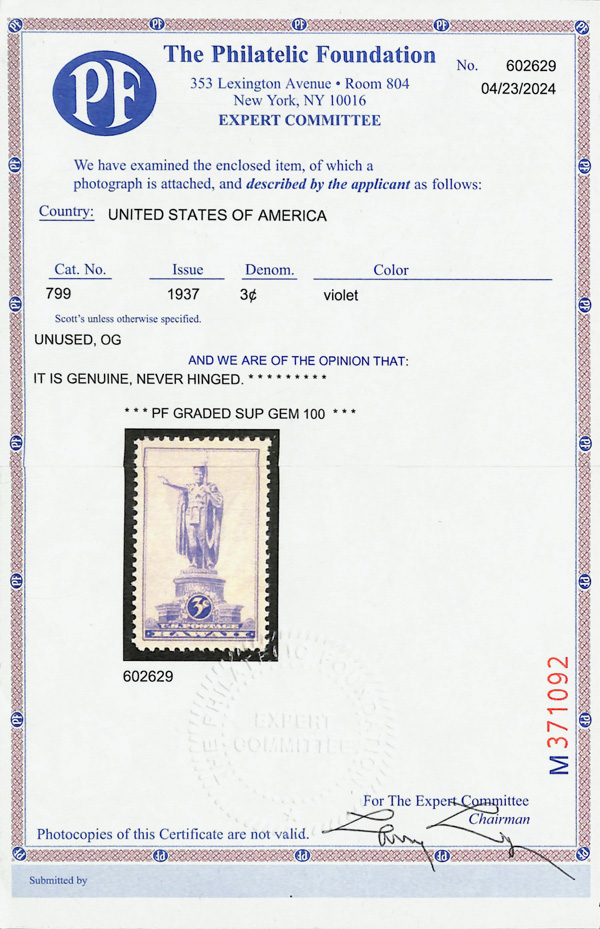 5438 nh 799 image1937, 3¢ Hawaii (Scott 799), o.g., never hinged, Superb, with 2024 P.F. certificate graded GEM 100.