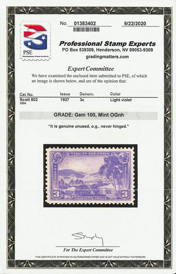 5440 nh 802 image1937, 3¢ Virgin Islands (Scott 802), o.g., never hinged, Superb, with 2020 P.S.E. certificate graded GEM 100.